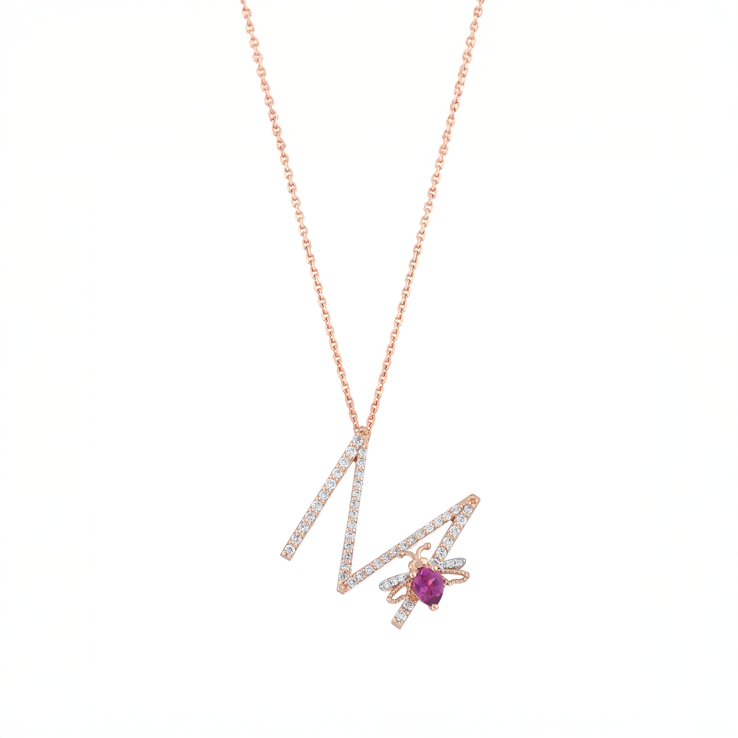 LETTER M GOLD DIAMOND RHODOLITE NECKLACE
